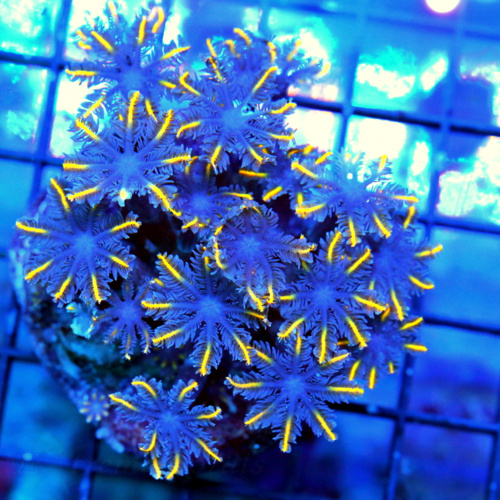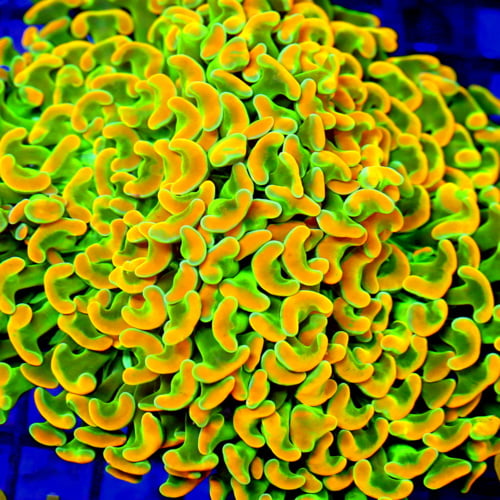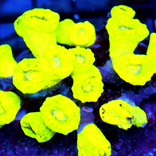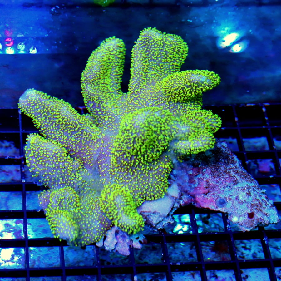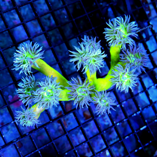 A branching LPS coral with bright, fleshy polyps. Available in neon green, blue, and other colors.